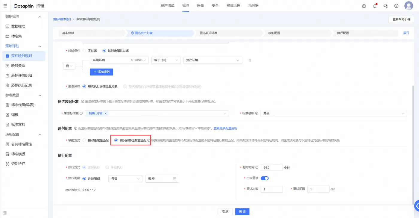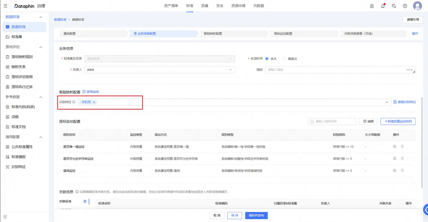 Dataphin提供【识别特征】,能够根据资产对象的具体内容为资产对象智能推荐标准