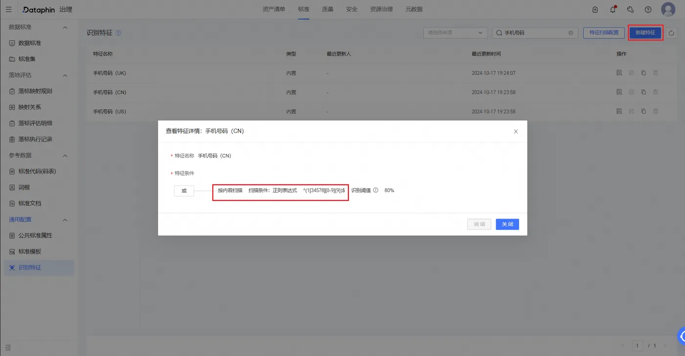 新建特征,条件选择按内容扫描,系统会根据设置的正则表达式对资产对象进行扫描,例如手机号码(CN)特征,如果某个字段超过80%的记录符合【^(1[34578][0-9]{9})$】这个正则表达式,则认为该字段符合这个识别特征