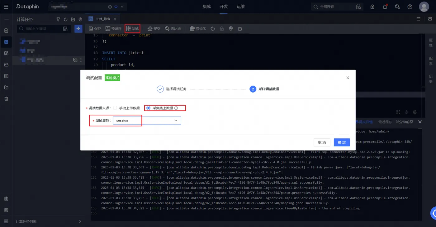 ④点击调试,选择采集线上数据,并选择我们刚刚配置的session集群即可