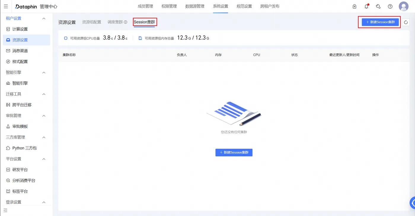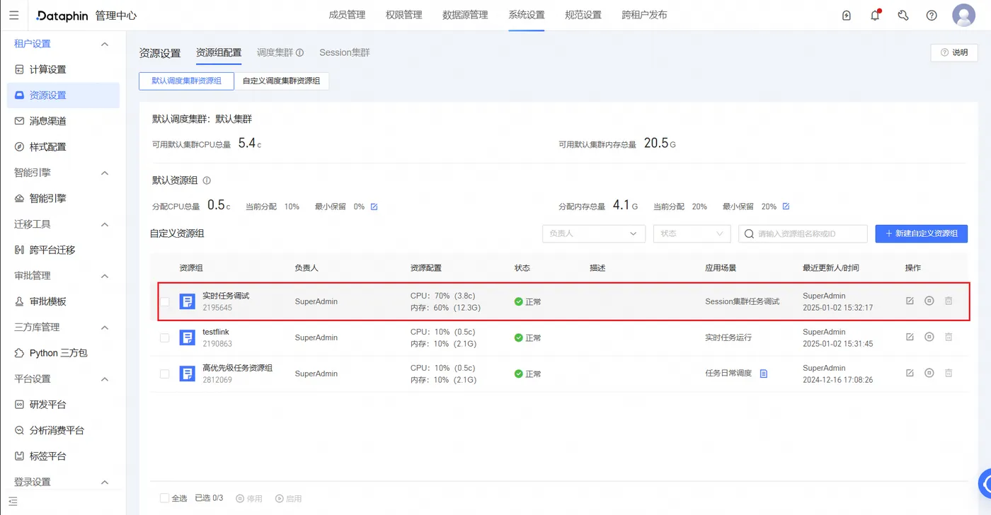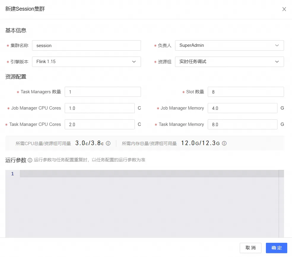 ①创建session集群前需要先在调度集群上划分一个资源组,之后的实时作业提交到session集群时,使用该资源组的资源(根据需求配置cpu和内存资源,最少不少于3c12g)