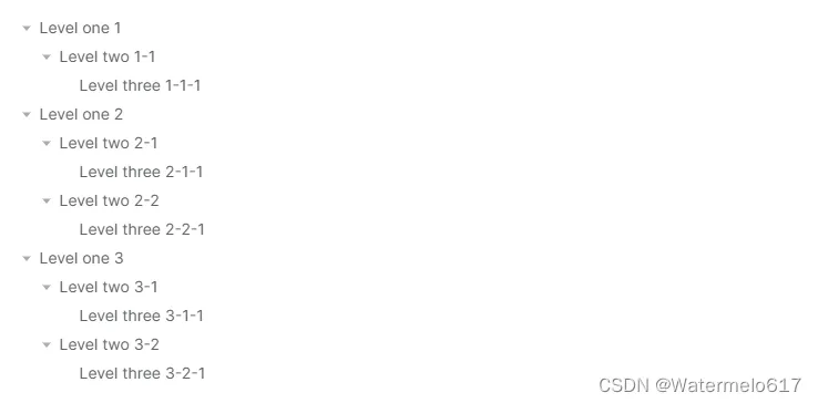 <template> <el-tree style="max-width: 600px" :data="data" :props="defaultProps" @node-click="handleNodeClick" /> </template> <script lang="ts" setup> interface Tree { label: string children?: Tree[] } const handleNodeClick = (data: Tree) => { console.log(data) } const data: Tree[] = [ { label: 'Level one 1', children: [ { label: 'Level two 1-1', children: [ { label: 'Level three 1-1-1', }, ], }, ], }, { label: 'Level one 2', children: [ { label: 'Level two 2-1', children: [ { label: 'Level three 2-1-1', }, ], }, { label: 'Level two 2-2', children: [ { label: 'Level three 2-2-1', }, ], }, ], }, { label: 'Level one 3', children: [ { label: 'Level two 3-1', children: [ { label: 'Level three 3-1-1', }, ], }, { label: 'Level two 3-2', children: [ { label: 'Level three 3-2-1', }, ], }, ], }, ] const defaultProps = { children: 'children', label: 'label', } </script>