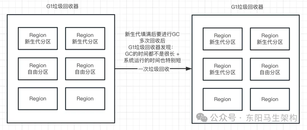 新生代500个Region,期望停顿时间100ms,新生代填满后要进行GC。多次GC后,G1发现GC时间都不是很长(50ms),系统运行时间也特别短。也就是GC频率比较高,但GC耗时非常短,说明此时的GC还不是很合理。G1希望让程序运行时间长一些、GC不要那么频繁、同时满足停顿时间。这时候就可以扩展分区,在新生代增加一些Region。原来新生代有500个Region,扩展为1000个Region。