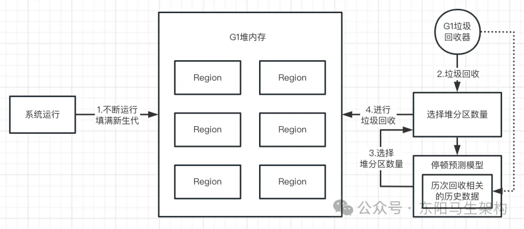 为满足设定的停顿时间,就要进行垃圾回收时间和程序运行时间的平衡。控制回收时间在一个范围内,根据回收时间和内存大小来综合计算。然后动态调整内存分区的占比,来满足回收时间。