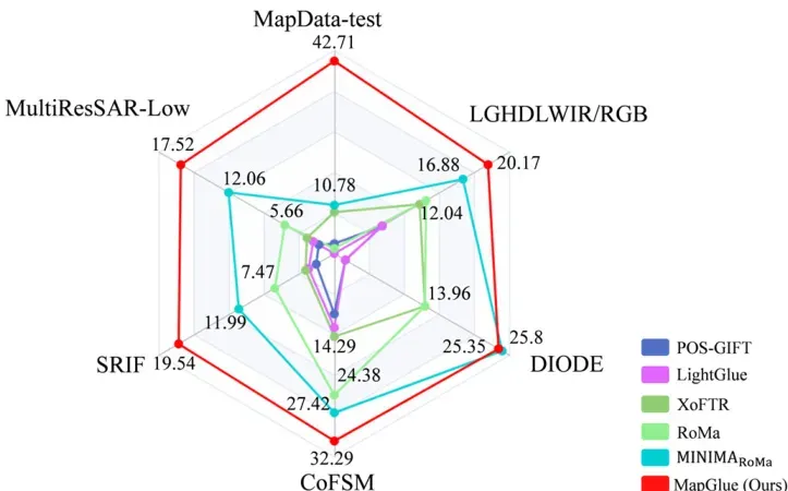武汉大学团队提出了MapGlue框架及MapData数据集,针对多模态遥感图像(MRSI)匹配中的几何和辐射差异难题。MapGlue通过双图引导机制提取跨模态不变特征,在全球233个采样点的大规模数据集上实现优异匹配精度,并在未见模态上展现强大泛化性。