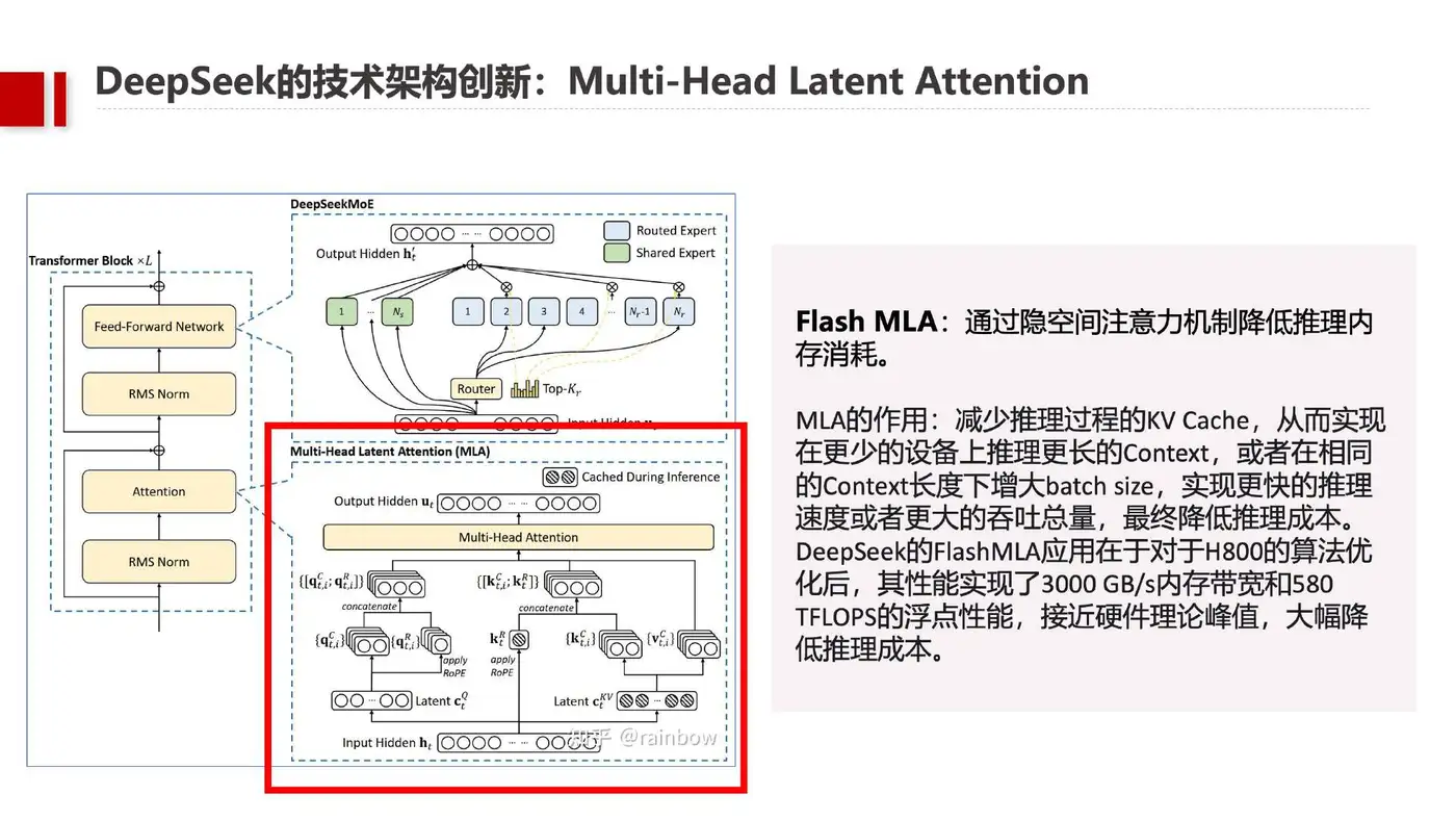 - Flash MLA隐空间注意力机制:通过优化KV Cache,推理内存消耗降低30%,H800 GPU内存带宽达3000 GB/s,浮点性能接近硬件理论峰值。