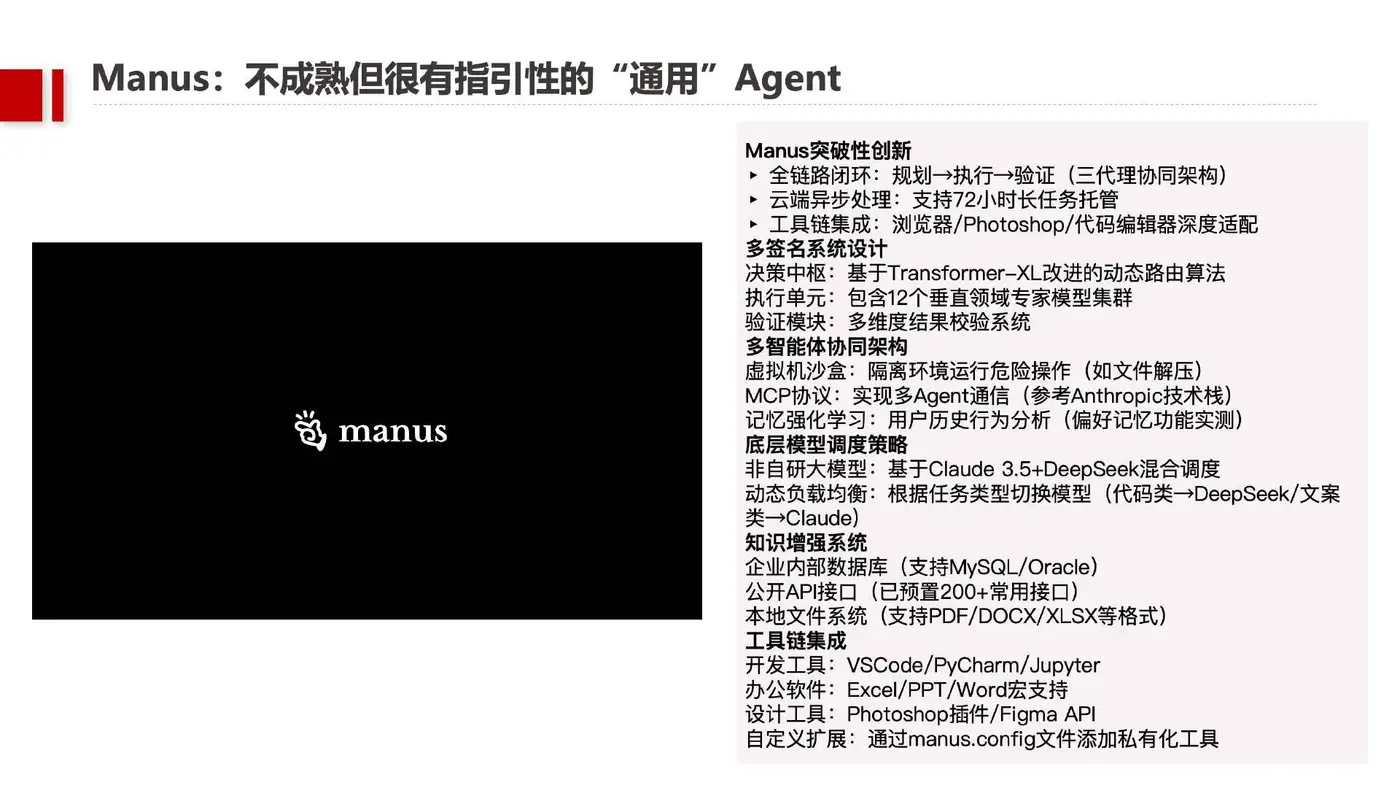 - AI Agent成为AGI钥匙:Manus等通用Agent通过“规划-执行-验证”闭环架构、72小时长任务托管及多模型动态调度。