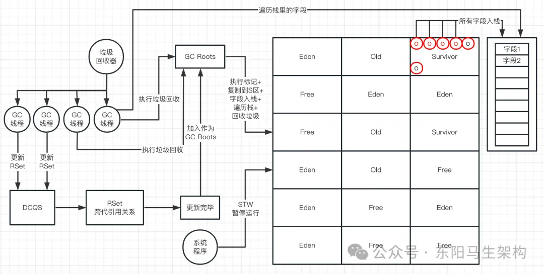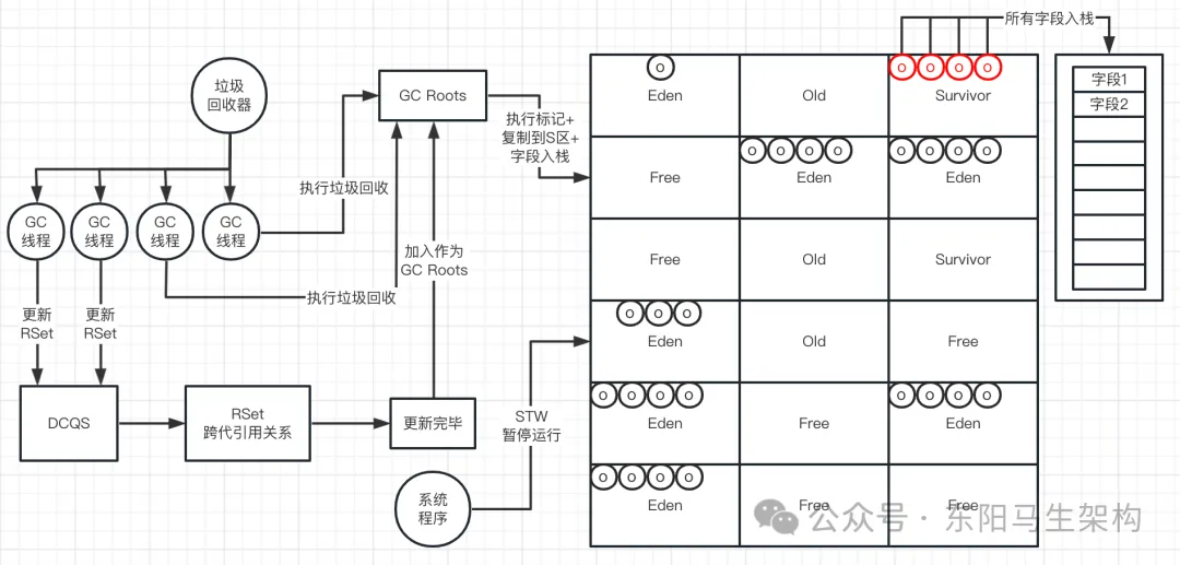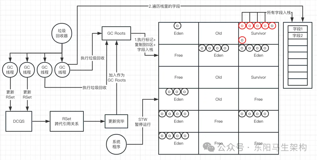 等到所有的GC Roots + RSet直接引用的对象都复制完毕后,再逐一对栈中的字段Feild进行遍历,找到所有存活的对象,然后再把找到的存活对象放入Survivor区中。