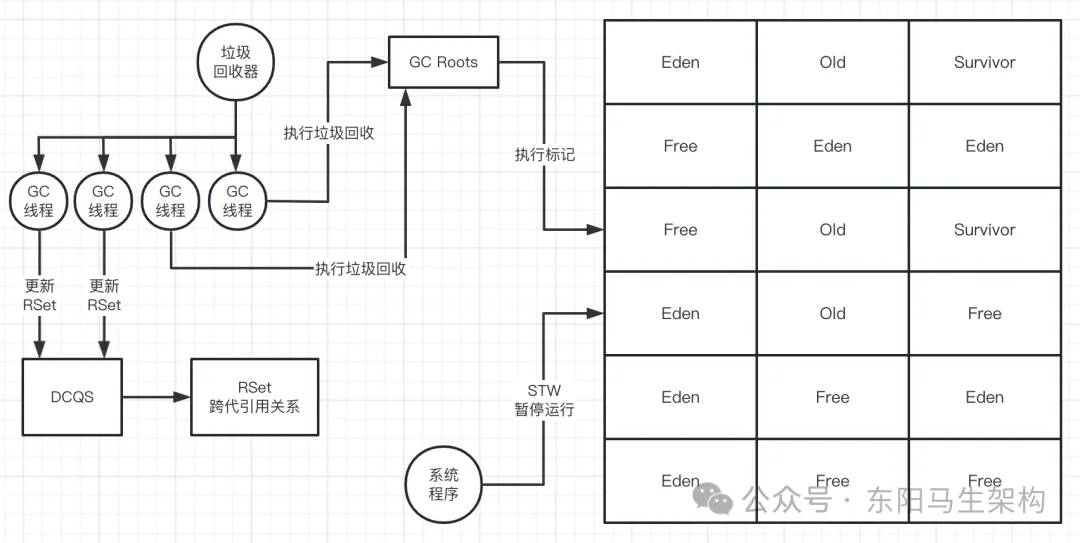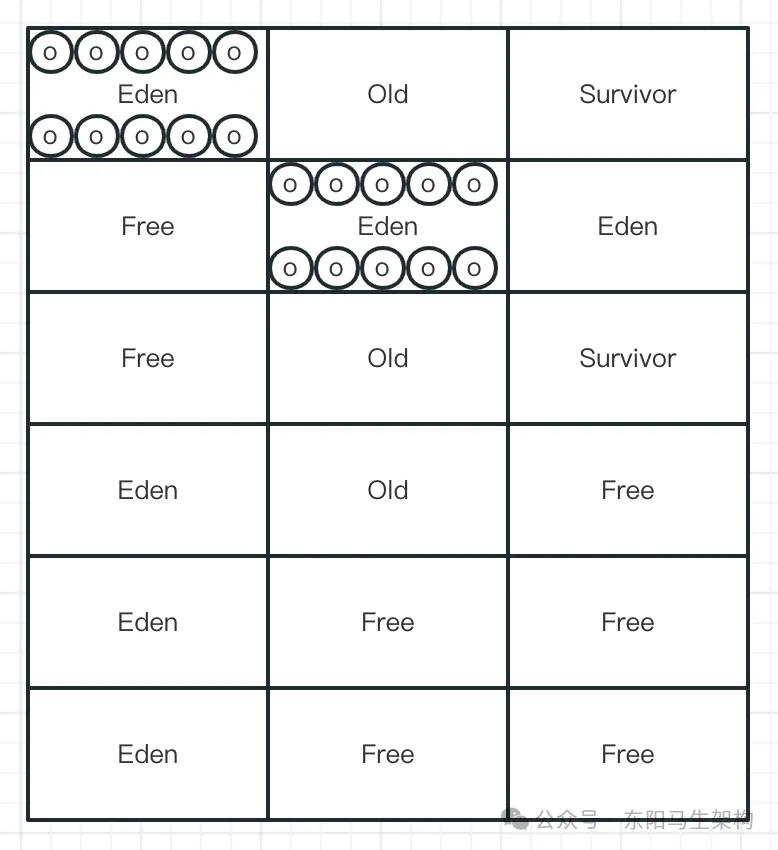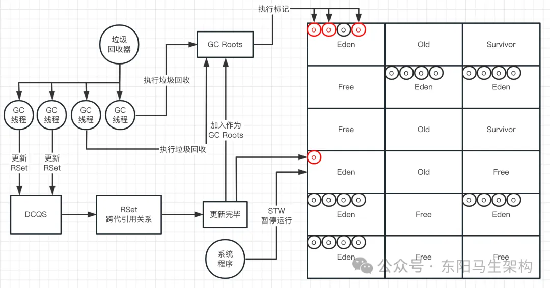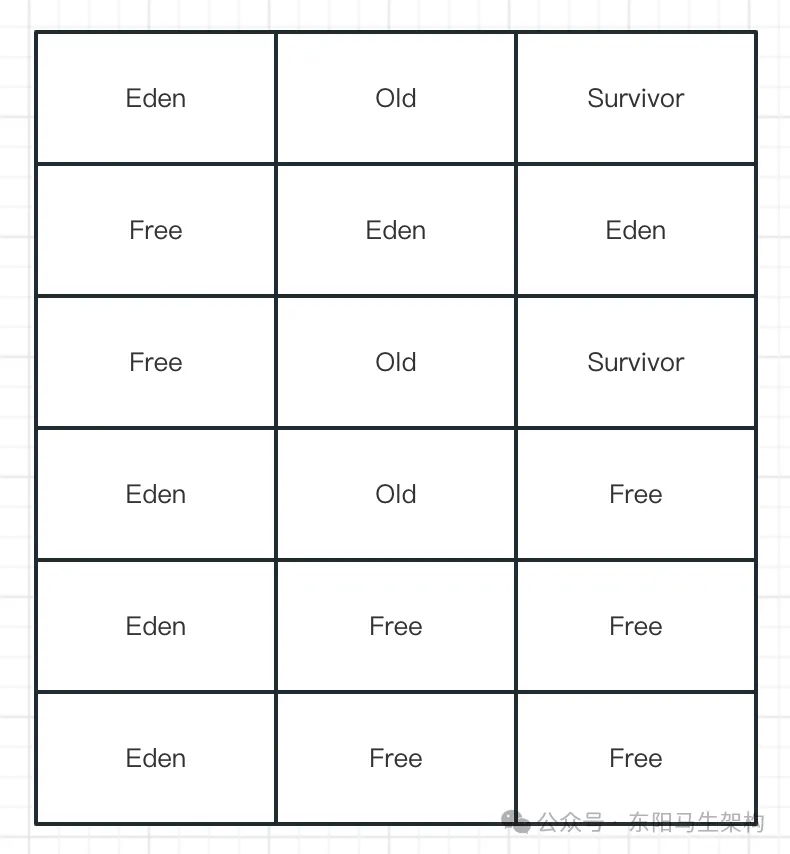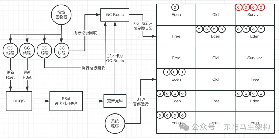 YGC使用的算法是复制算法,也就是会把新生代的所有Region按照Eden、Survivor做类型标识。在执行垃圾回收时,首先对存活对象进行标记。然后把存活对象复制到S区,接着就把所有的垃圾对象全部回收掉。注意:G1的Region分布,对于一个分代而言,不一定是连续的。