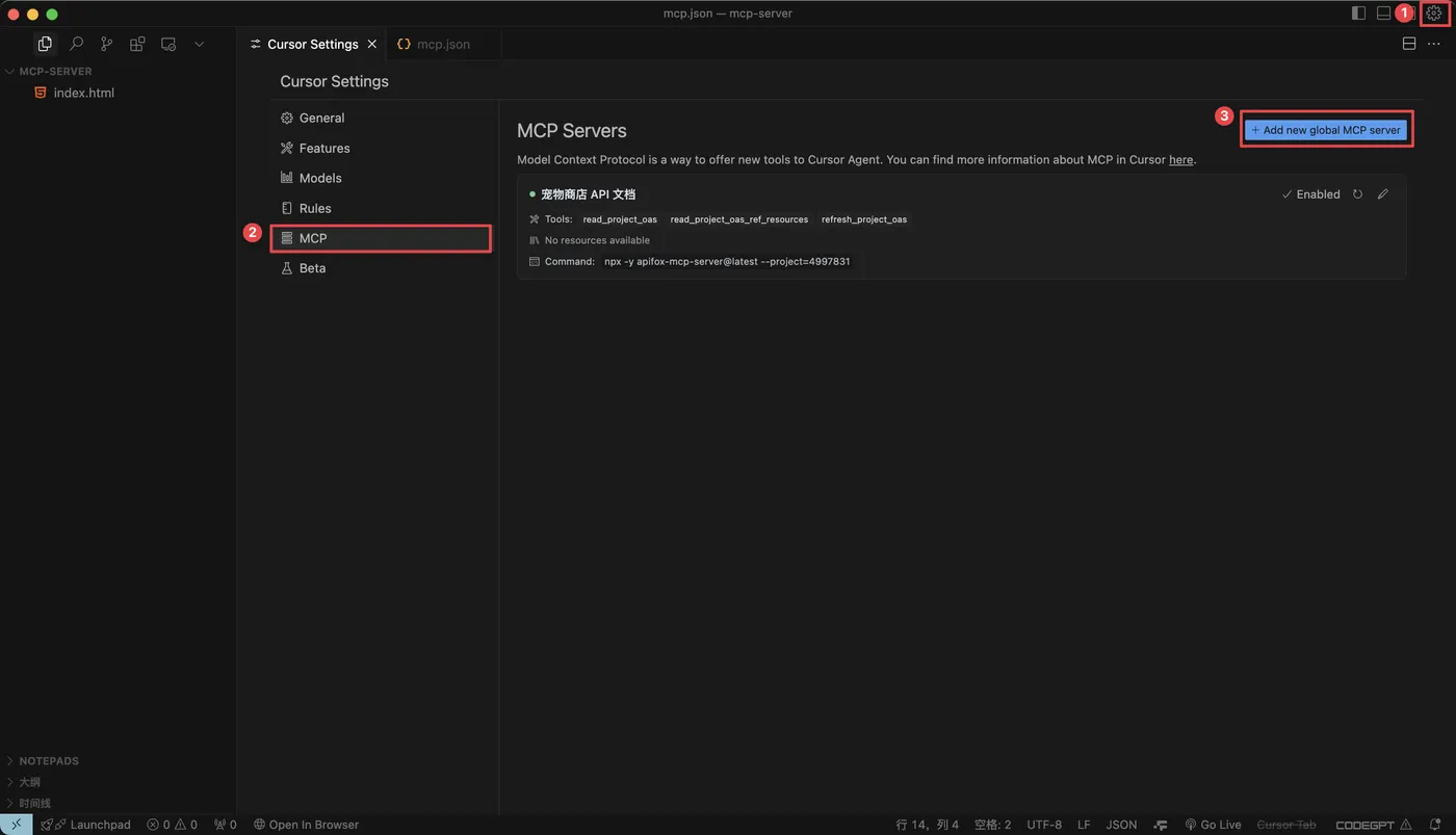 - 打开 Cursor,点击右上角「设置」图标,选择左侧「MCP」选项,然后点击「+ Add new global MCP server」按钮。
