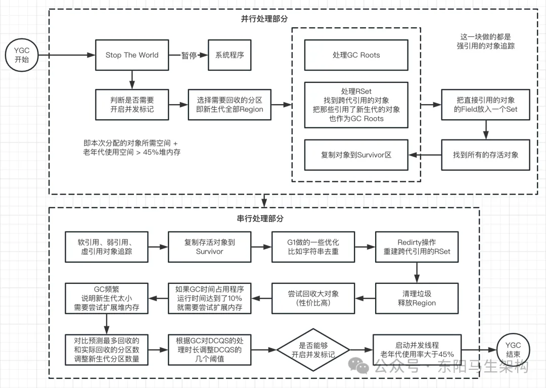 前面的YGC流程在最后一步才判断是否开启并发标记,但这是不准确的。实际上,在YGC开始时就会判断一下本次是否要尝试开启并发标记。因为如果当前老年代占用 + 本次分配对象已经超过45%的堆内存,那么大概率在YGC最后一步就要开启并发标记了。所以这时在YGC开始时就可以直接设置一个Flag标记表示可以开启,在YGC过程中就可以根据这个Flag标记提前并行把一些前置的工作做了。然后在YGC结束时,结合其他的判断条件,再尝试启动并发线程即可。