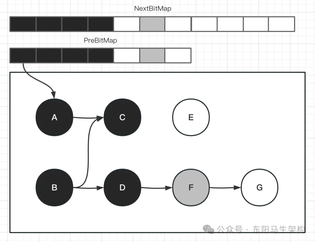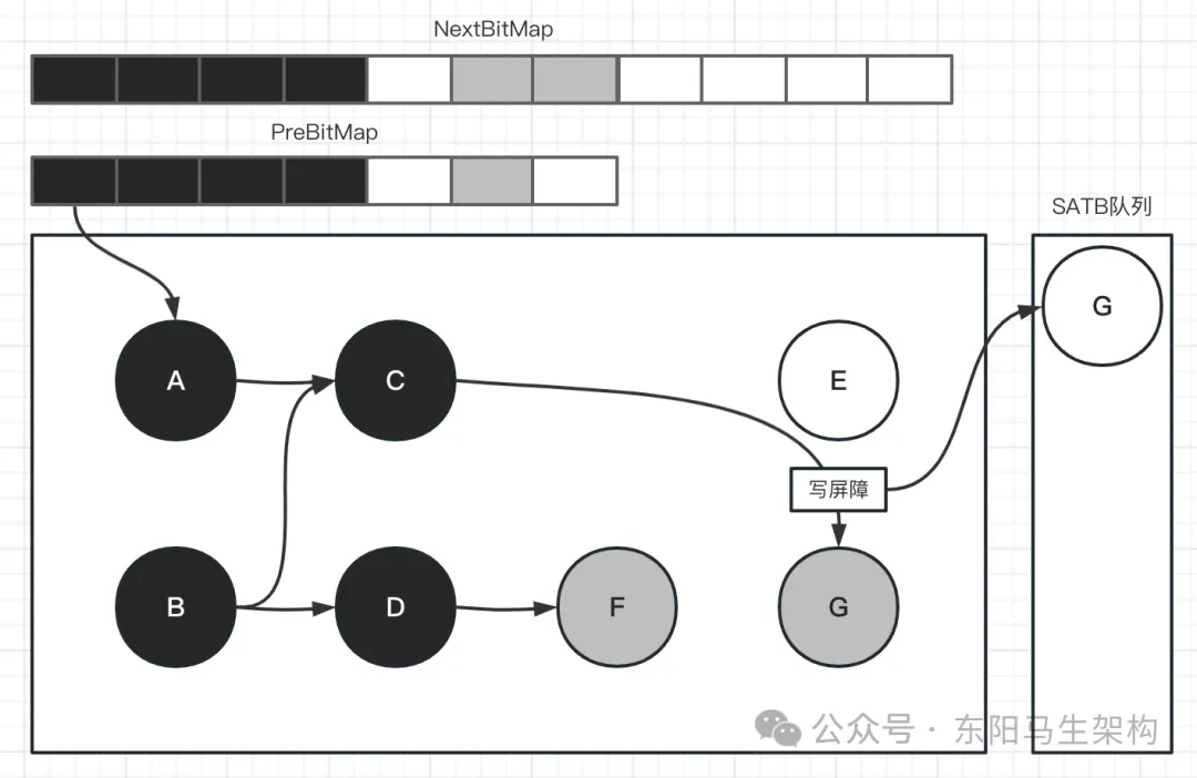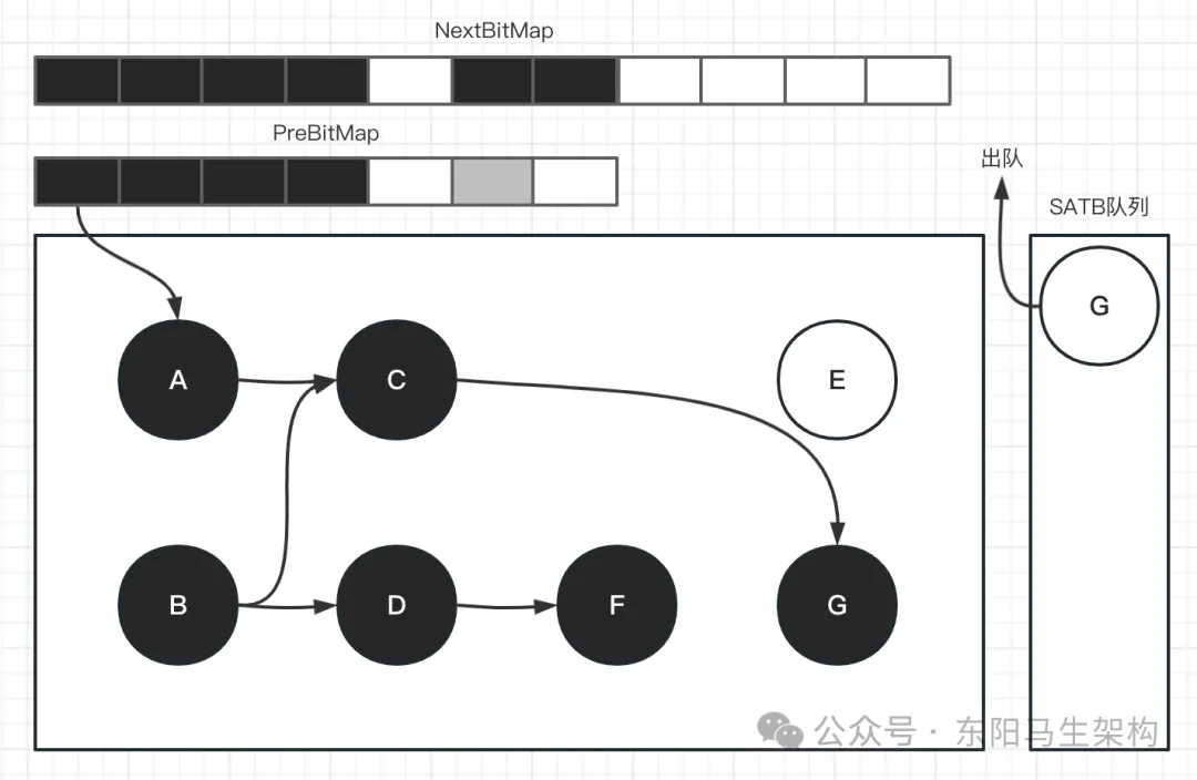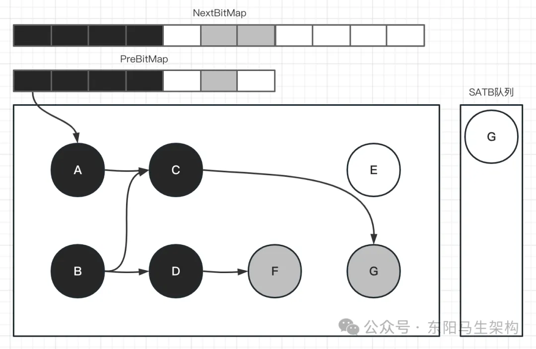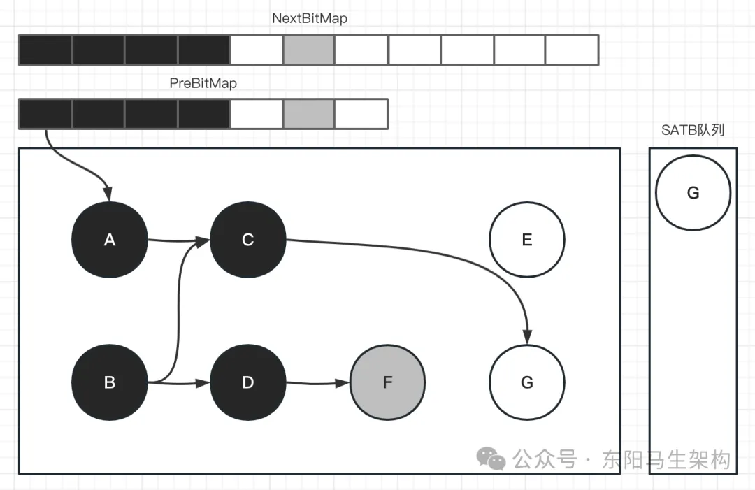 像CDF这些对象不需要重新标记,只需要把G是否可达分析一下即可。所以对SATB队列里的对象进行可达性分析,就能把全部对象正确标记上。最终整体的标记状态,就会是如下图示: