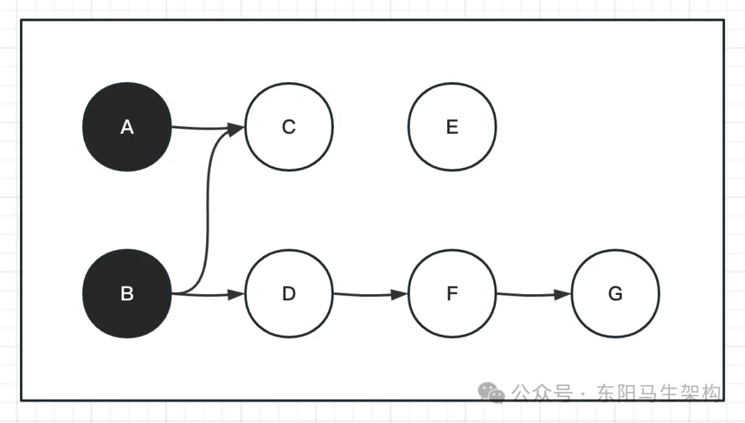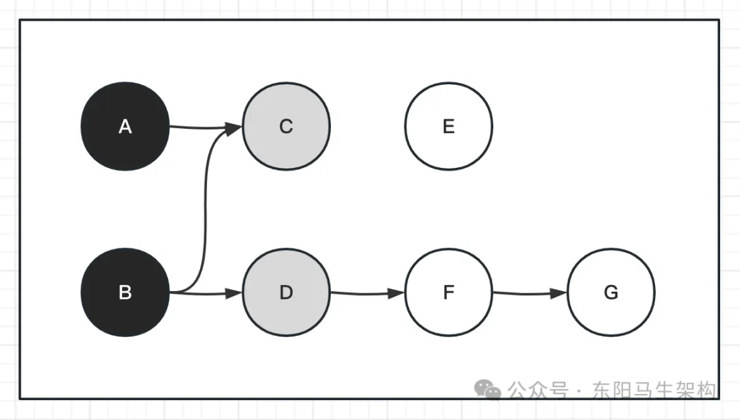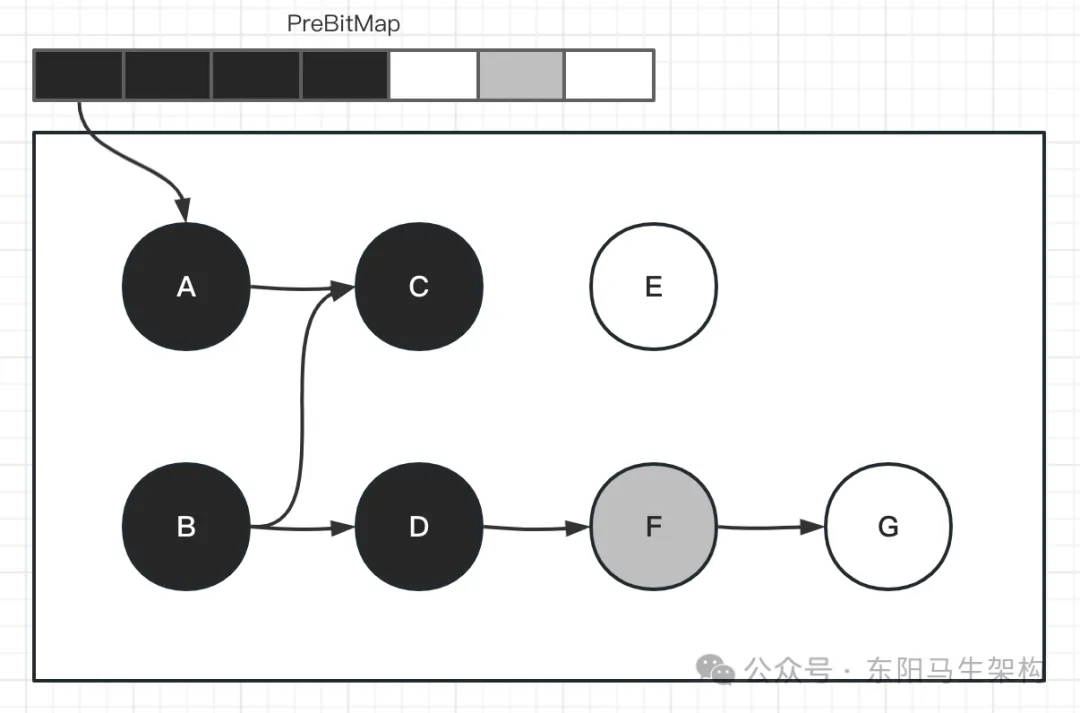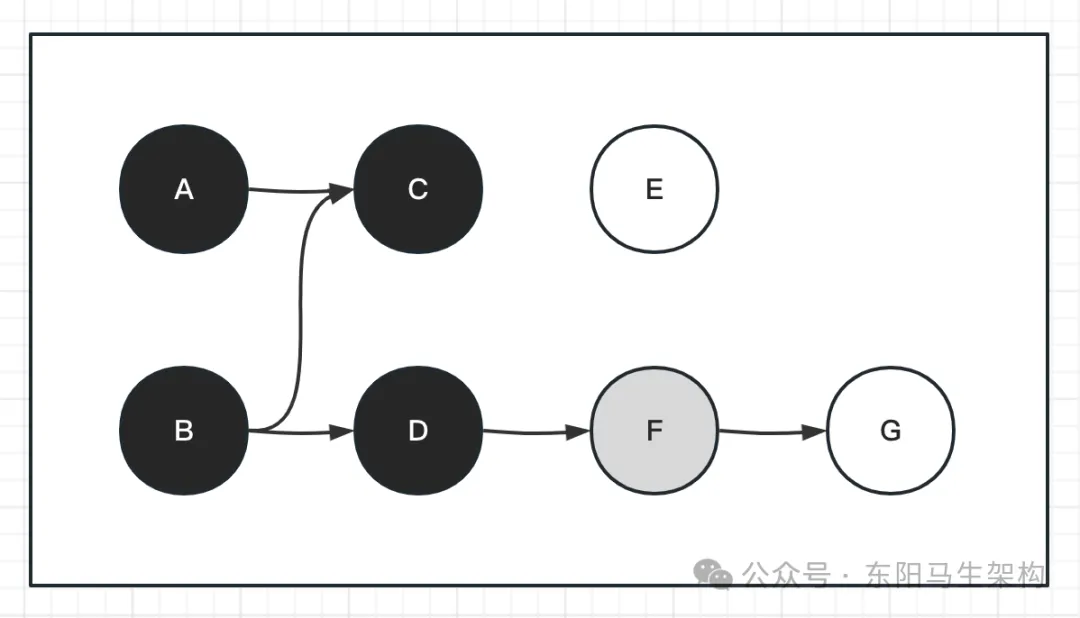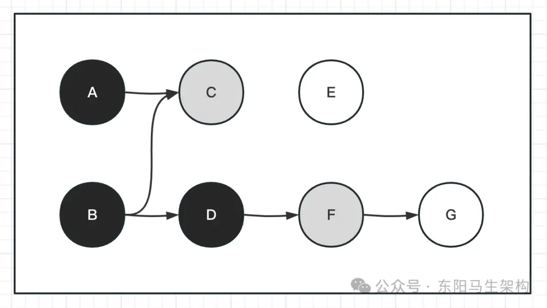像CDF这些对象不需要重新标记,只需要把G是否可达分析一下即可。所以对SATB队列里的对象进行可达性分析,就能把全部对象正确标记上。最终整体的标记状态,就会是如下图示:
