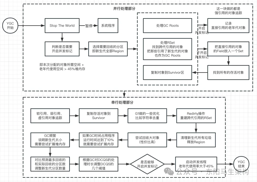 YGC其实是Mixed GC的前奏,或者说YGC是Mixed GC的初始标记阶段。从YGC、Mixed GC、FGC间的过程转换关系图可知,某次YGC后可能会直接进入Mixed GC的并发标记阶段。所以当某次YGC结束后开启Mixed GC的并发标记,那么就代表了Mixed GC已经完成了初始标记阶段,这时可理解为YGC已处理完Mixed GC初始标记阶段的工作了。