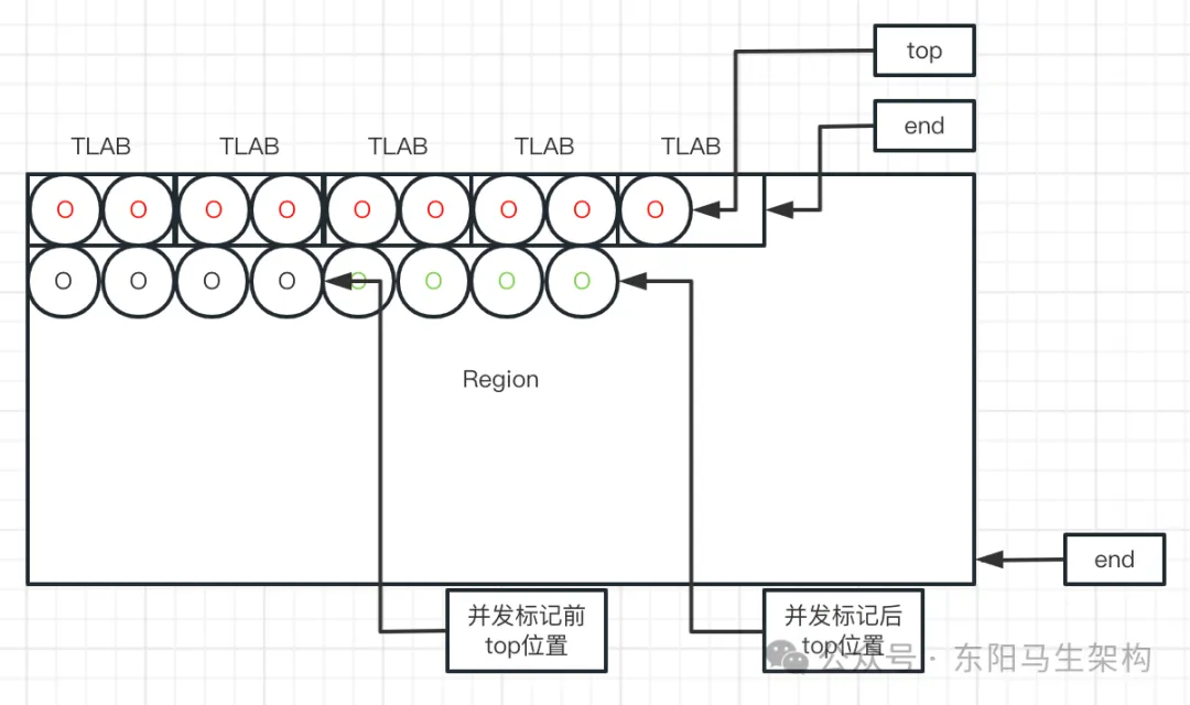 如果并发标记进行了一段时间,在某一个Region里,新对象以及已经被标记的对象会如下所示: