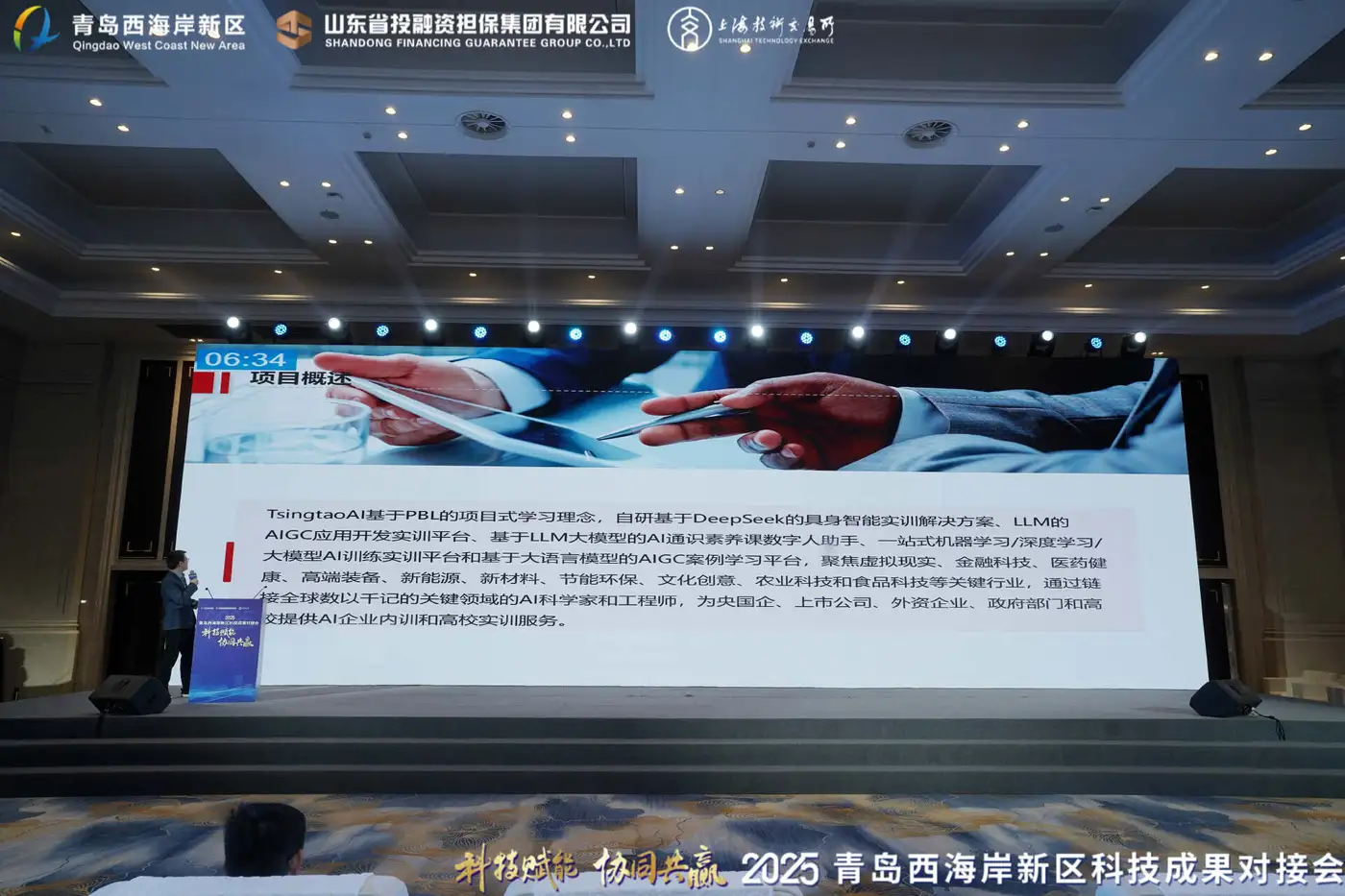 3月26日青岛——由青岛市科学技术局指导、青岛西海岸新区管委联合上海技术交易所等多家机构主办的“2025青岛西海岸新区科技成果对接会”在青岛金沙滩蓝海御华酒店盛大启幕。青岛市委常委,西海岸新区工委书记、区委书记孙永红,青岛市科学技术局副局长张栋华和上海技术交易所总裁颜明峰等参加会议并致辞。TsingtaoAI受邀参会并发表主题分享,公司负责人汶生以《基于DeepSeek的具身智能实训》为题,向与会嘉宾展示了AI具身智能技术如何突破传统边界,助力AI人才从实验室走向产业一线。