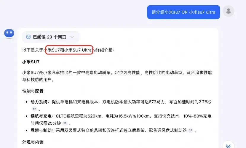 - 例子:请介绍小米su7 OR 小米su7 ultra