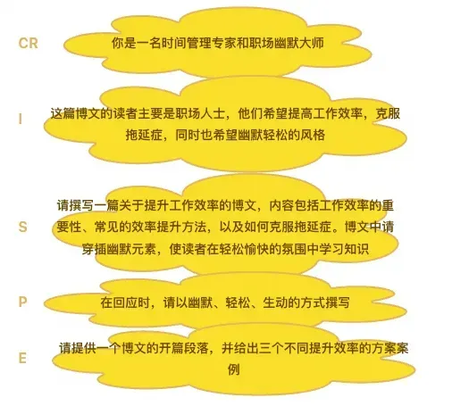 以上是基础的prompt框架,在处理更复杂的问题时,还需要掌握另一种更加高级的prompt框架 -- CRISPE框架。