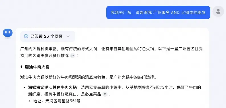 - 例子:我想去广东,请告诉我 广州著名 AND 火锅类的美食