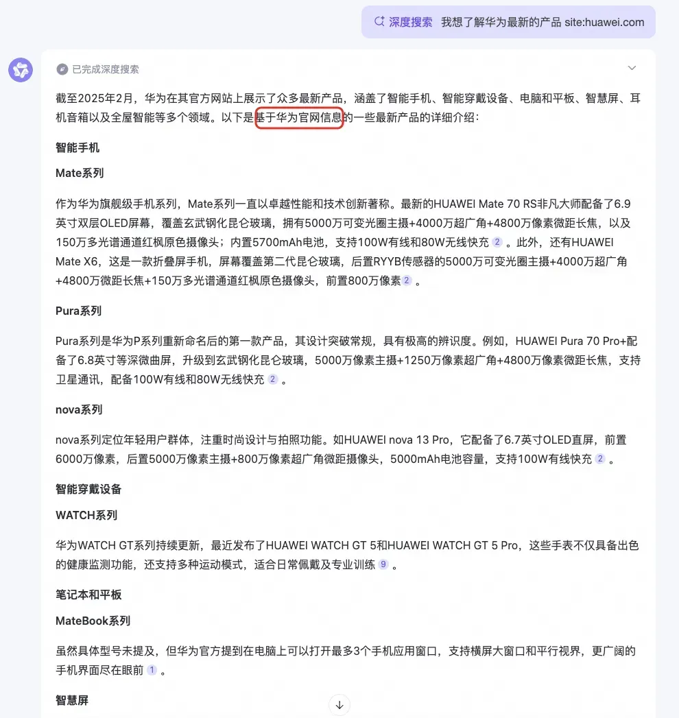 site语法可以帮助我们在检索时,让大模型优先根据我们指定的网站来进行检索,比如我想要查找华为的最新产品,并且是来自于华为官网的信息,那么我可以直接指定:site:huawei.com/cn。这里以通义为例: