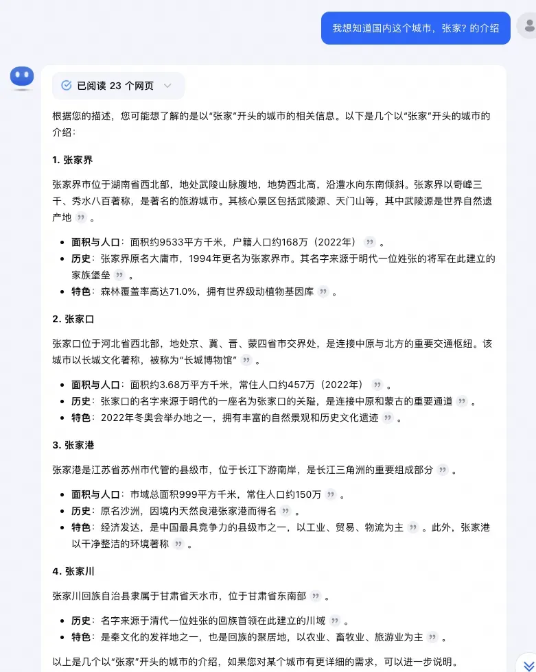 - 例子:我想知道国内这个城市,张家? 的介绍