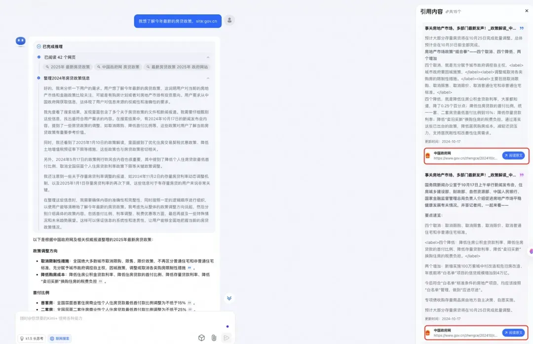 或者我想问今年最新的房贷政策,要求大模型的总结来源一定是某政府网站,我可以用.gov.cn来结尾,这里我以kimi为例: