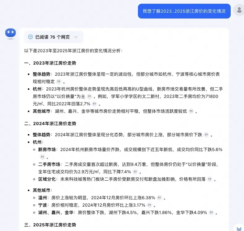 可以通过datarange: 或直接 .. 进行检索资料的时间限定,筛选特定时间段的文档。比如:我想要检索2023年到2025年间的浙江房价: