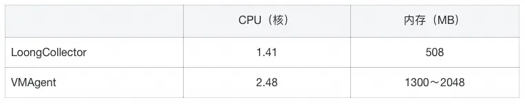 对于Prometheus抓取,我们设定一个通用负载场景,即单个LoongCollector副本负责抓取1000 Targets。在这个背景下,我们对比了LoongCollector和VMAgent的采集性能,结果如下: