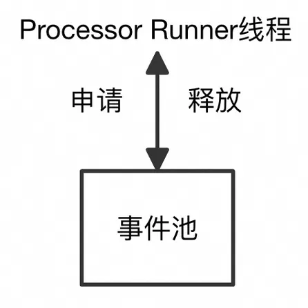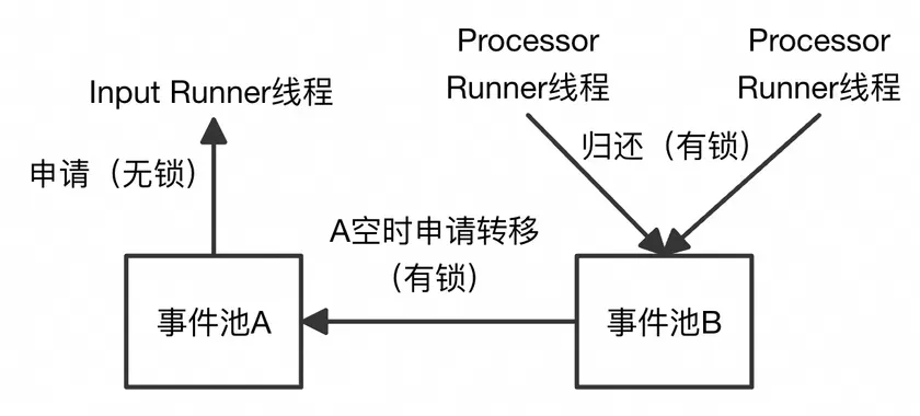 显然,在当前场景下,如果继续沿用场景一的策略,会直接失效。这是因为Input Runner线程只负责生产事件,不存在归还事件的可能。为此,当前场景的合理策略为,Processor Runner线程在归还事件时,应该将该事件归还到对应的Input Runner线程。因此,可以在Input Runner线程中维护一个事件池,Processor Runner线程将事件归还到该事件池中。