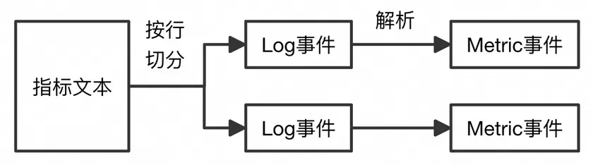在Prometheus抓取场景中,输入插件会首先通过网络请求抓取指标文本,然后对指标文本按行切分,最后对指标文本行进行解析生成最终的Metric事件。由于解析文本行的操作是在Processor Runner线程中进行,因此原始文本行必须以PipelineEvent的形式传递给线程。显然,从语义的角度,Log事件是一个比较合适的载体。