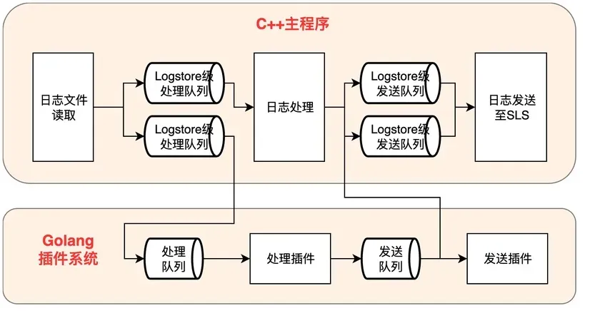 iLogtail由C++主程序和Golang插件系统构成。由于历史原因,在iLogtail时代,C++部分的能力仅为采集和解析日志文件并发送至SLS后端,整体架构如下所示: