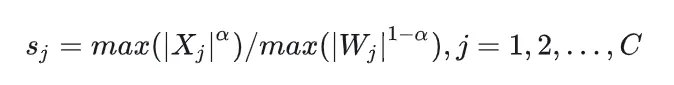 为了解决激活值的量化误差问题,有人提出了 smoothQuant 算法。这个算法的原理很简单:让X除以一个值s,W乘以s,这样的话,X/s和W/s的分布就会更加平滑,同时(X/s)*(W*s)=X*W,保证乘积不变。s的计算公式如下: