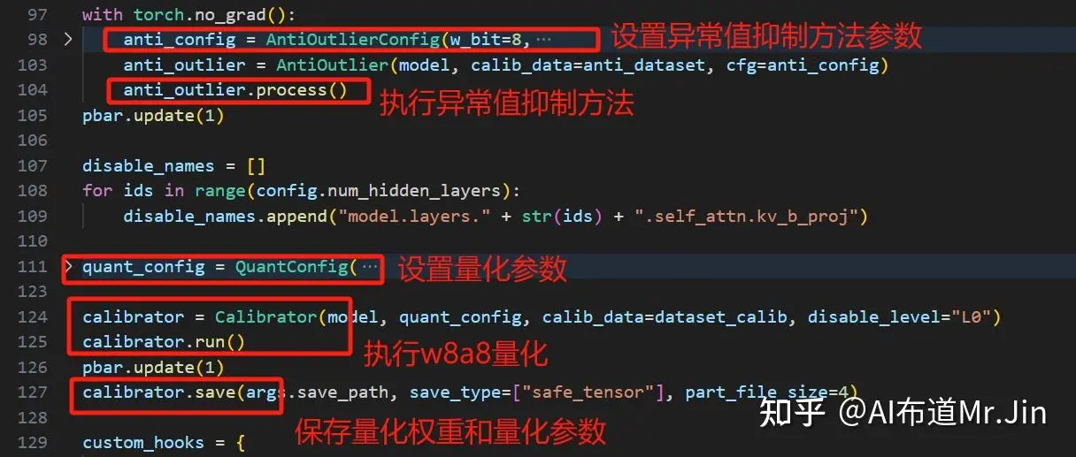 上图是deepseek w8a8量化入口脚本,主要包含3个部分:异常值抑制、w8a8量化、保存量化权重和相关参数。