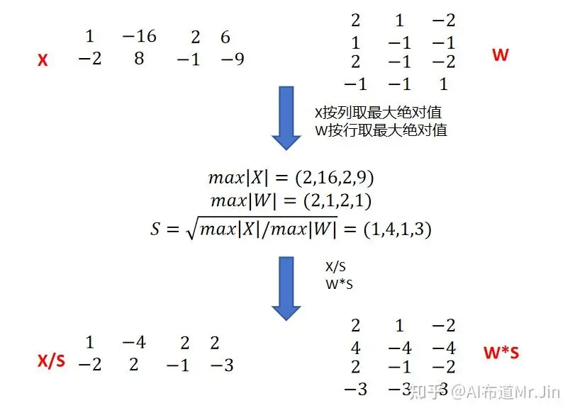 其中 Xj 代表 X 的第 j 列, Wj 代表 W 的第 j 行, α 一般取0.5。示例如下: