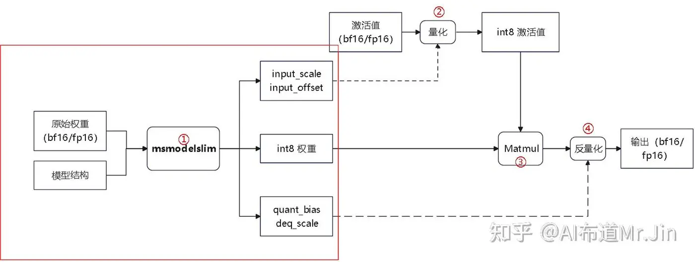 ①,使用昇腾 msmodelslim 仓库提供的量化接口对原始模型权重进行量化,生成int8格式的权重文件,以及后续在推理的时候要用到的激活值的量化参数和 matmul 结果的反量化参数;