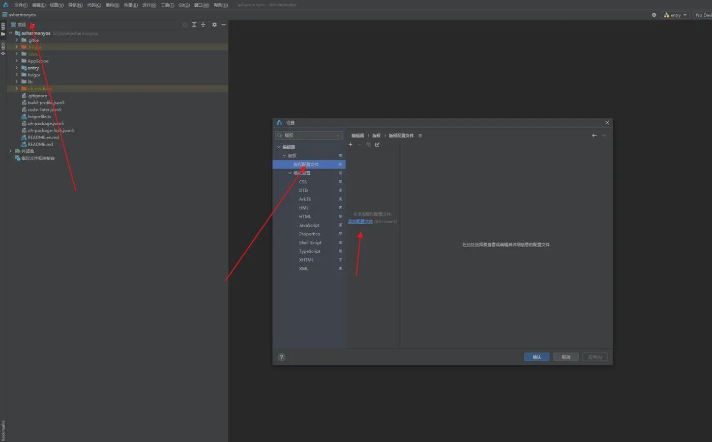 - 打开文件:在 DevEco Studio 项目视图中,找到你想要添加版权声明的文件并打开。