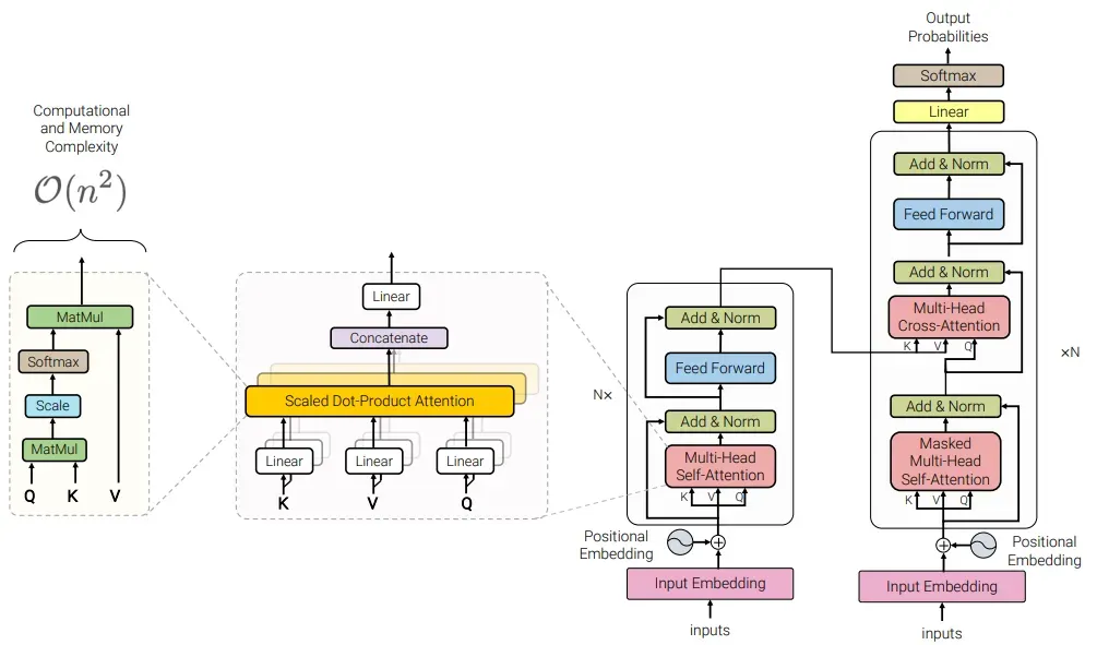 而模型的输出是基于输入序列往后的迭代式生成,基于Transformer decoder架构的注意力机制会参考前文的词来生成当前词,如下图所示,注意力机制是给每个输入序列中的词分配一组query、key、value向量(qkv通过每个词的向量和预设的矩阵相乘得到),然后在计算当前词输出时,会根据前一个词的query向量和前文序列中每一个词的key向量做点积得到一个分数score,这个就是相关性分数,score越大,该score对应的前文向量对当前词的输出影响越大,然后把前文序列中每一个词的score乘自己的value向量,再加权求和得到当前词向量,该词向量再通过前馈神经网络判断出当前的单词,以此类推,直到整个输出序列生成完毕;这就是基于注意力机制的大模型生成逻辑;