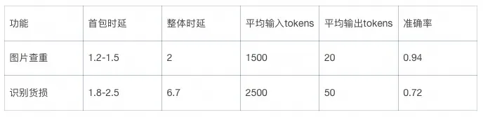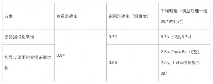具体的测试数据对比如下,图片查重的数据是单张图片维度的测试结果,识别货损的数据是组维度(一组5-10张图片)的测试结果: