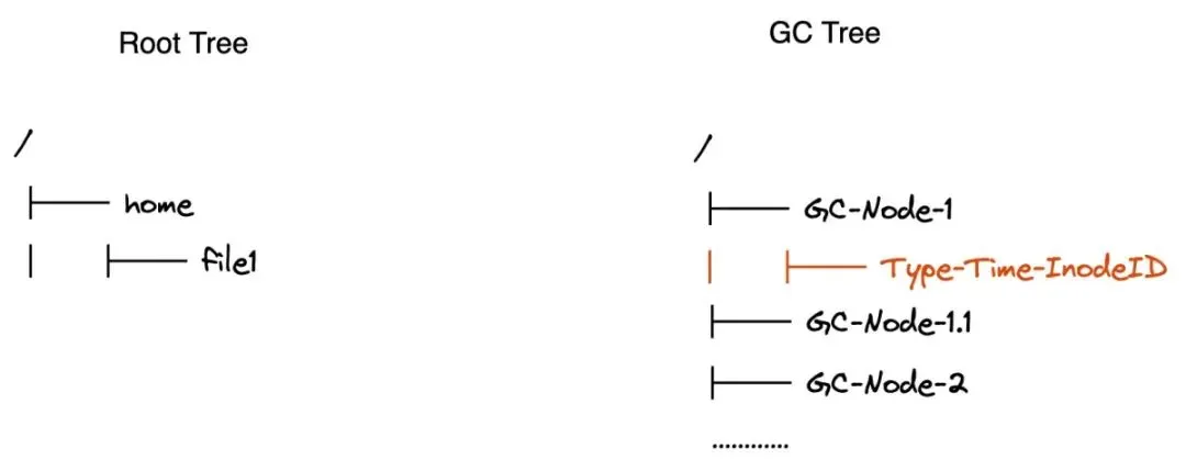 在该回收站设计下,与Root目录树(InodeID为0)相对,在逻辑层元数据服务虚拟出另外一颗GC目录树(InodeID为1),该目录树为不同NodeID划分到多个专属的GC目录,目录名编码格式为GC-InodeID.x;而被删除的文件和目录会被相应的Node挪到自己回收站目录下,其命名规则为Type-Time-InodeID: