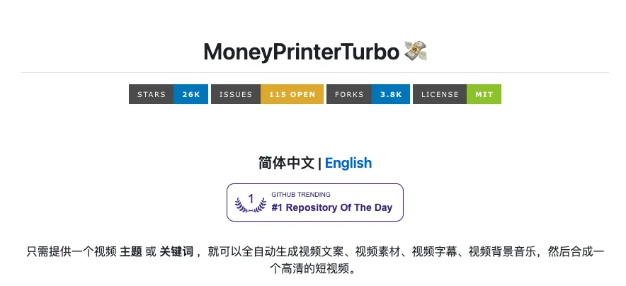 | MoneyPrinterTurbo | 全流程自动化/开源可定制 | 需配置本地环境 | MIT |