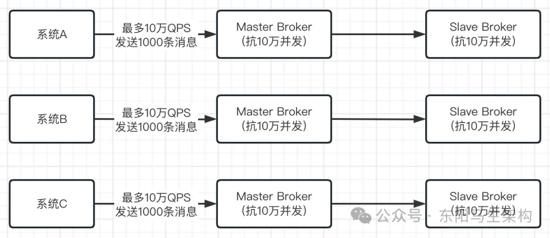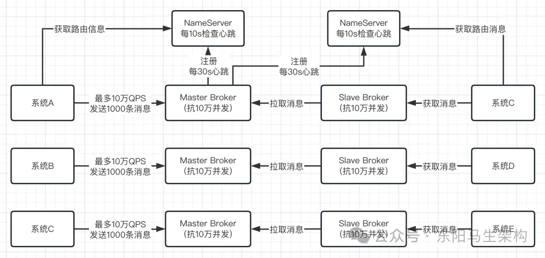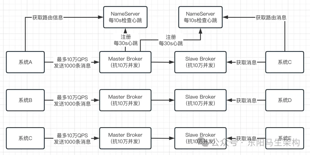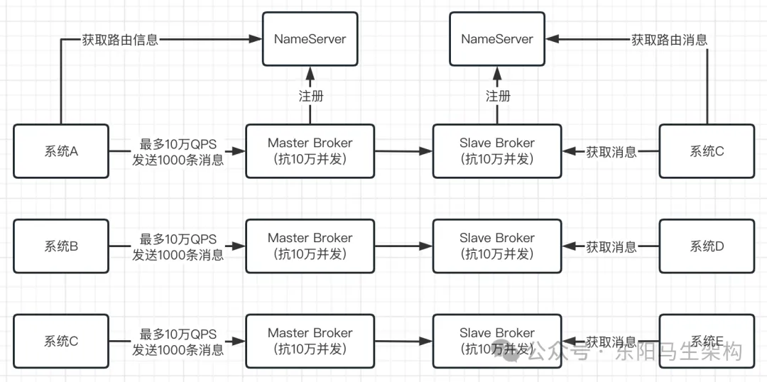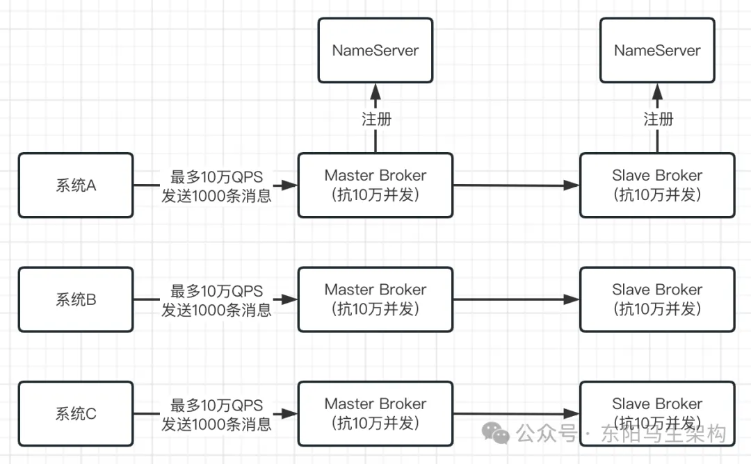 当RocketMQ部署在一台机器上,即使这台机器配置很高,但一般来说一台机器也就支撑10万+的并发访问。假设有大量的系统都要往RocketMQ里高并发的写入消息,可能有每秒几十万请求。此时由于RocketMQ是可以进行集群化部署的,通过部署RocketMQ在多台机器上,假设每台机器都能抗10万并发,然后只要让几十万请求分散到多台机器上、让每台机器承受的QPS不超过10万即可。如下图示: