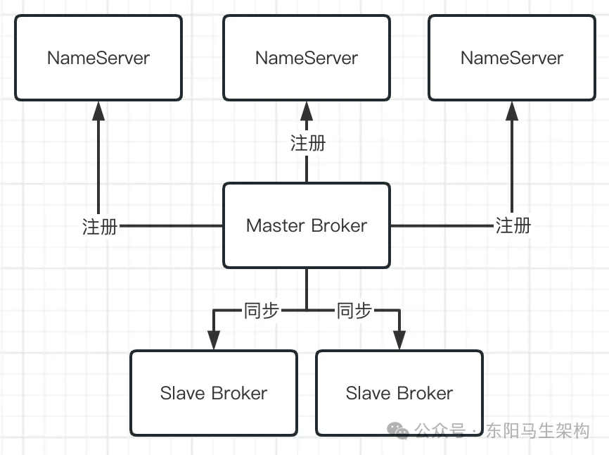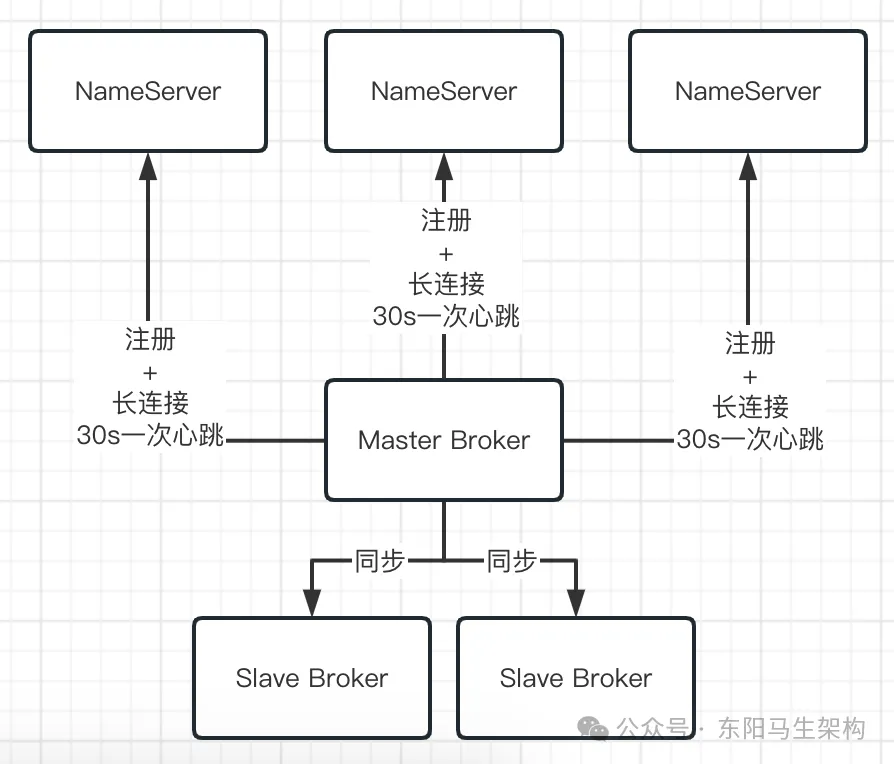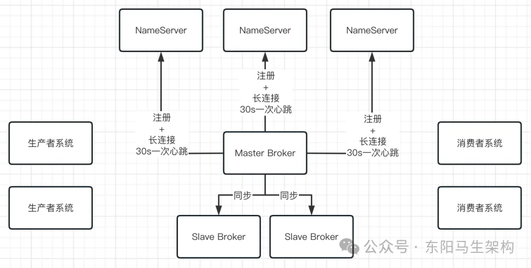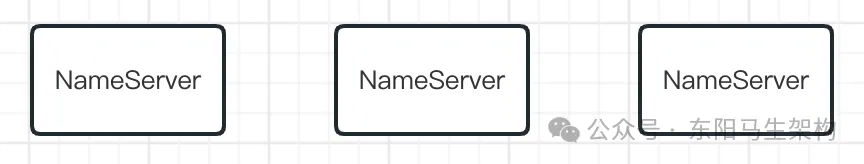 RocketMQ为了解决这个问题,引入了NameServer,它也是独立部署在几台机器上的。然后所有的Broker都会把自己注册到NameServer上去,通过NameServer可以知道集群里有哪些Broker。如下图所示: