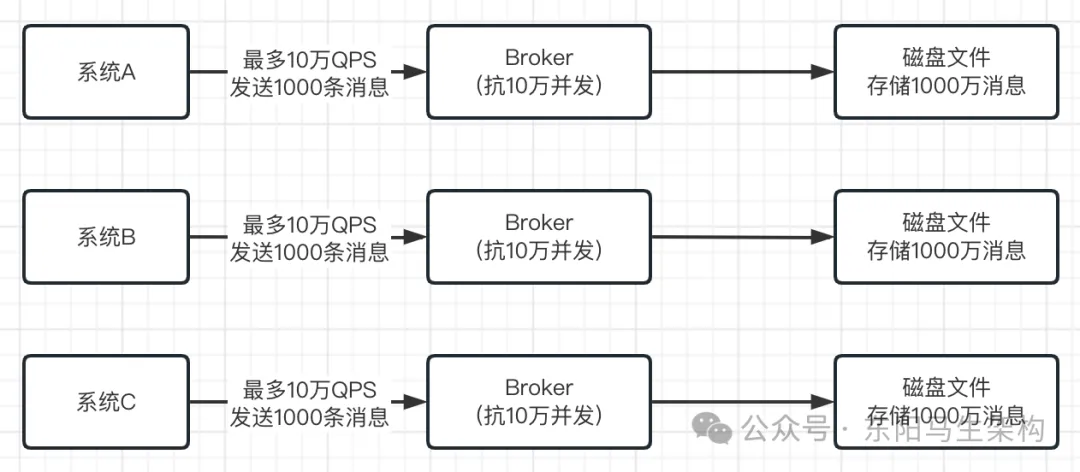 为什么呢?因为数据库复杂,它要能够支持执行复杂的SQL语句,支持事务等复杂的机制,支持对数据进行增删改查等。所以一般数据库单服务器也就支撑每秒几千的请求。但MQ就不一样了,它的核心功能就是让系统A发消息给它,再让系统B从它这里获取消息。这个就简单得多了,所以同等机器配置下,MQ一般都能抗几万并发请求。