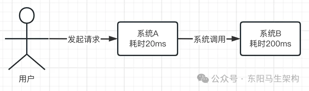 比如现在假设系统A要调用系统B。然后系统A先执行一些操作,需要耗费20ms,接着系统B执行一些操作要耗费200ms,总共就要耗费220ms。这时等系统A和系统B都处理完,才能返回结果给用户,要等待220ms。