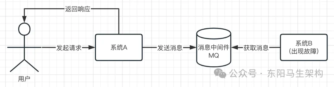 假设在系统A和系统B之间加入一个消息中间件。在这种情况下,系统A对系统B的调用仅仅是发送一个消息到MQ,然后就直接返回给用户了,后面对系统B就不管了。此时系统B如果出现了故障,对系统A根本没影响,系统A也感觉不到。系统B出现故障就成了它自己的事,它要等故障恢复后继续去完成它的工作,此时对系统A没任何影响了。