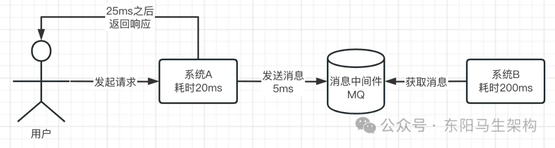 如果在系统A和系统B之间加一个MQ:系统A干完自己的事情,就20ms,然后发送一条消息到MQ,就5ms,然后就返回结果给用户了。也就是说,用户仅仅等待25ms就收到了结果。然后系统B从MQ里获取消息,接着花费200ms去执行。但是这个200ms就跟用户没关系了,用户早就收到结果了,也不关心你花200ms还是2s去干自己的事。