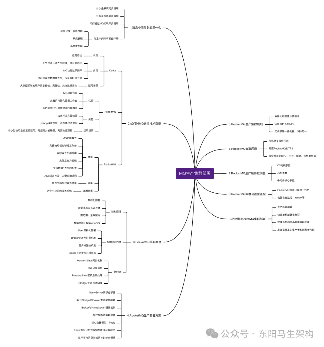 消息中间件集群生产部署架构规划的梳理,如下图示。从消息中间件到底是什么开始,然后考虑如何对MQ进行技术选型,接着了解RocketMQ的核心技术原理,然后是RocketMQ的生产部署方案如何制定,接着开始上手部署一个小规模的RocketMQ集群,同时做好集群的可视化监控,并且对小规模的RocketMQ集群进行生产级的参数调整,然后对RocketMQ集群进行压测,最后根据压测结果规划一个生产集群进行部署。
