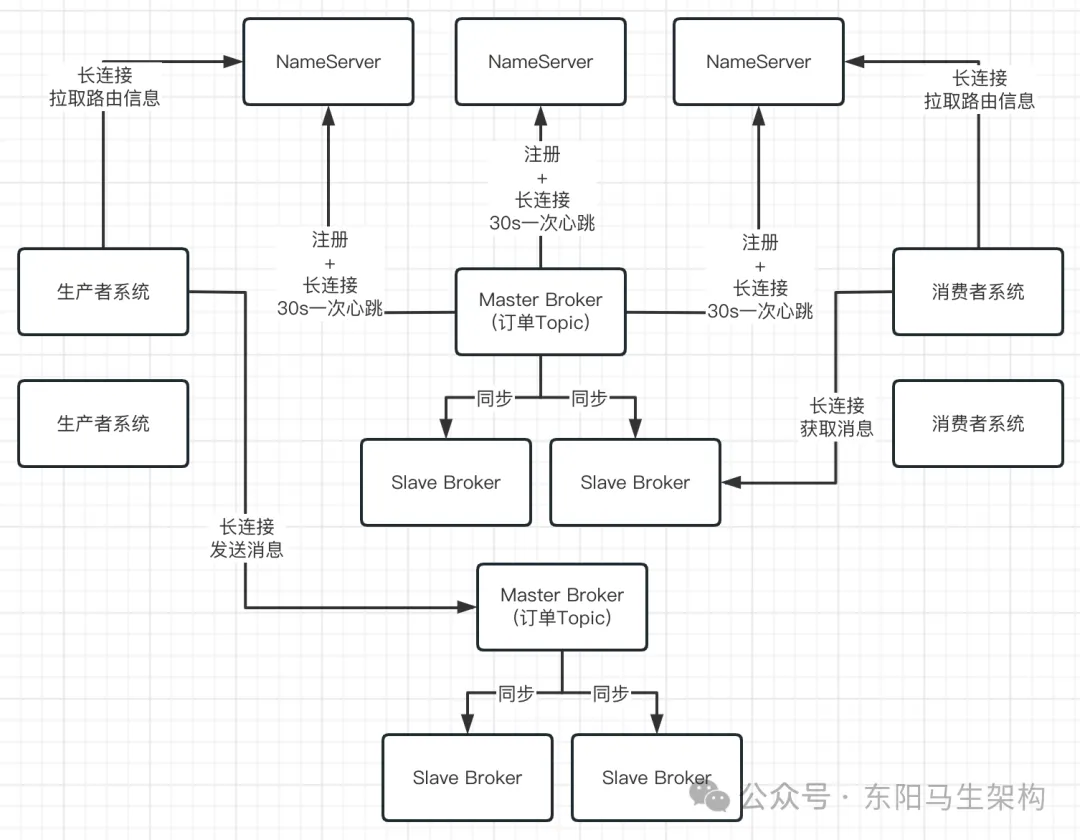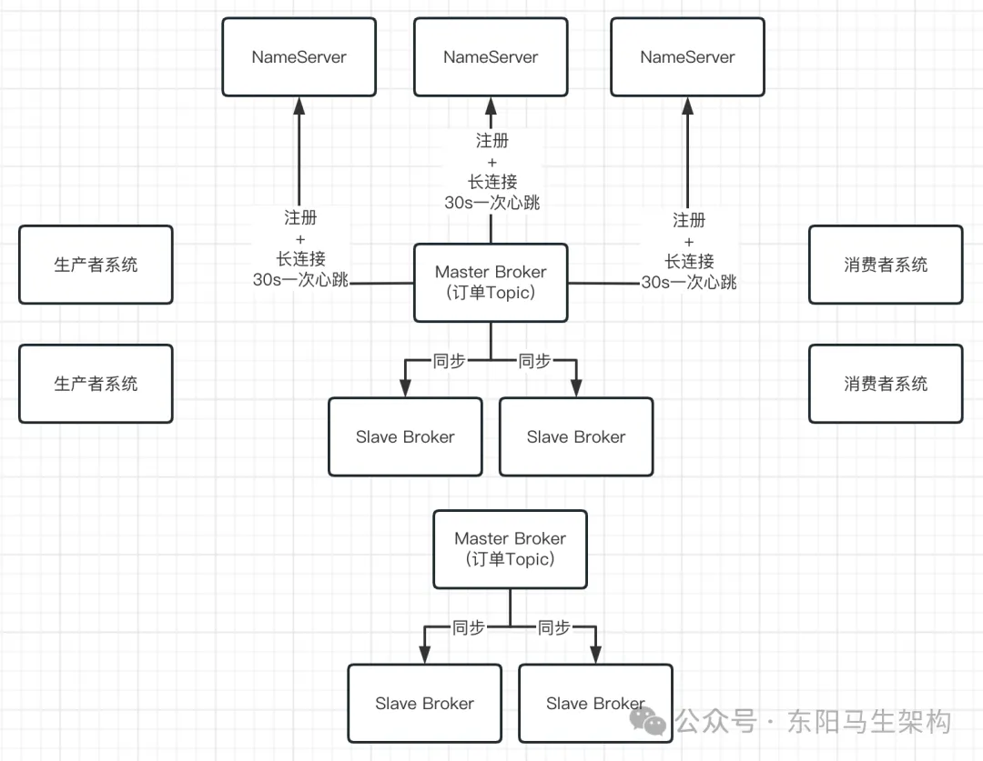 RocketMQ的解决思路是使用Broker主从架构以及多副本策略。简单来说,Broker有Master和Slave两种角色。Master Broker收到消息之后会同步给Slave Broker,这样Slave Broker上就能有一模一样的一份副本数据,这样同一条消息在RocketMQ整个集群里就有两个副本了:一个在Master Broker里,一个在Slave Broker里。这时候如果任何一个Master Broker出现故障,还有一个Slave Broker上有一份数据副本,可以保证数据不丢失,还能继续对外提供服务,保证了MQ的可靠性和高可用性。