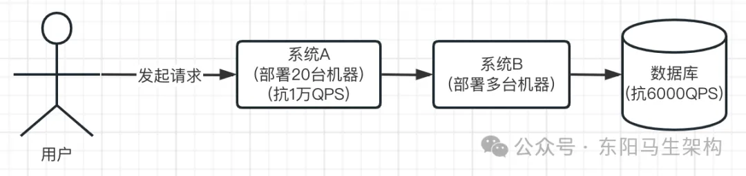 消息中间件还有一个特别好的功能叫流量削峰。假设系统A是不操作数据库的,因此只要多部署几台机器,就可以抗下每秒1万的请求。比如部署个20台机器,就可以轻松抗下每秒上万请求。然后系统B是要操作一台数据库服务器的,这台数据库服务器的上限是每秒接收6000请求。那么系统B无论部署多少台机器都没有用,因为它依赖的数据库最多只能每秒接收6000请求。