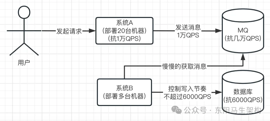 比如系统A在1秒内收到了1万请求,然后把这1万请求转发给系统B。由于系统B要操作数据库,每秒最多能处理6000请求,所以此时系统B是抗不下这1万请求的,一定会压垮数据库。因此可以通过引入MQ来解决这个问题,MQ抗高并发的能力远远高于数据库。同样配置下,如果数据库可以抗每秒6000请求,那么MQ可以抗每秒几万请求。