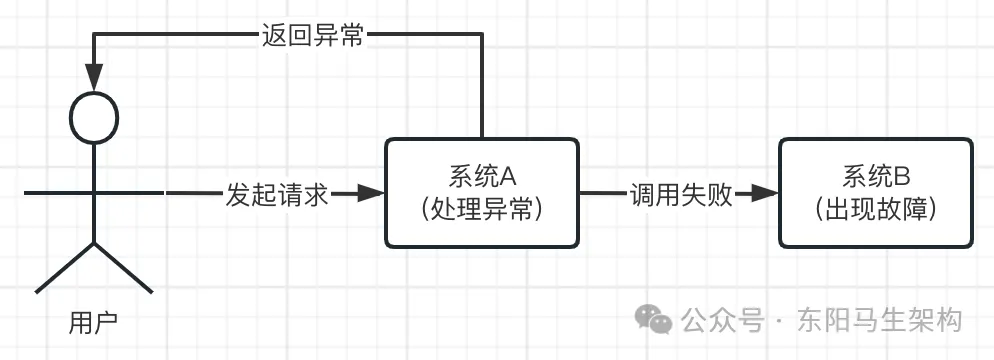 如果系统A同步调用系统B,这其实属于系统间的耦合,系统A和系统B互相之间会有影响。如果系统B突然出现故障,会导致系统A在调用系统B的时候感知到这个故障。由于系统B故障了,所以系统A对系统B的调用失败。系统A就得返回异常给用户,以及在后续处理这个异常。
